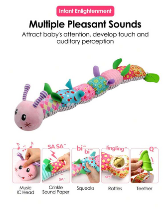 • Infant Musical Toy: This adorable caterpillar toy is not just a plush toy, but also a musical and rattle toy in one. The hidden music box in the head of the caterpillar plays lively and cute music when you press it, while the other parts of the toy are designed with a baby rattle, BB squeaks, and crinkle sound paper.