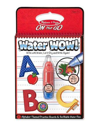 This exciting activity book includes four reusable pages and a refillable water pen. Use the pen to fill in each activity, from coloring in boxes to tracing letters, and see hidden colors and pictures appear with every stroke! Then simply let the page dry to erase the pictures and fill it in again and again. This alphabet-themed book includes every letter of the alphabet (uppercase and lowercase) to trace, alongside pictures of familiar objects to illustrate each sound. There are empty lines for practice, too! The chunky-sized water pen is easy for kids to hold and stores neatly right in the front cover.