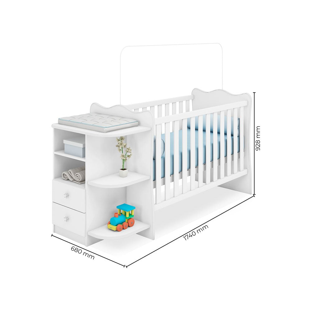 • Generous Storage: The integrated dresser includes two drawers, and shelves perfect for organizing baby clothes, diapers, and other essentials, keeping your nursery neat and tidy.