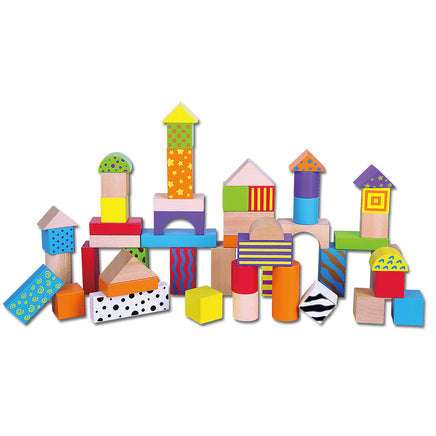 This high-quality 50-piece wooden block assortment from Viga includes natural wood and hand-painted patterns. Assorted shapes and sizes enable children to build anything that they can imagine. Blocks measure approx. 30mm in size.